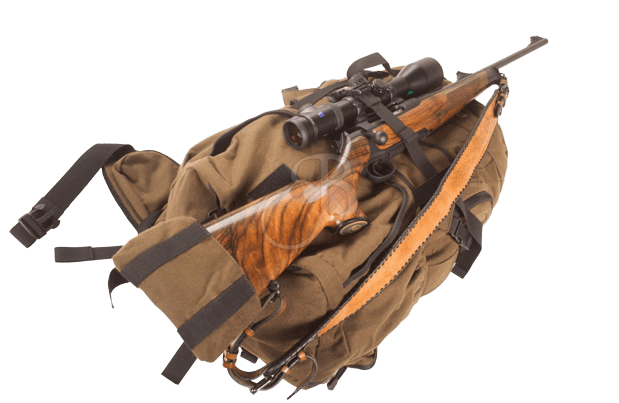 Hægt að festa riffilinn við bakpokann og nota sem stuðning fyrir skot.